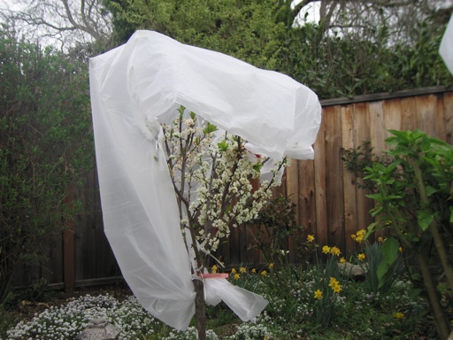 I covered our apricot tree again yesterday afternoon with a new clear drop cloth. This time I used a 1 mil 10′ x 20′ drop cloth, hoping the extra thickness would make it less prone to being torn by the wind. I also covered our multi-grafted pluot tree, which was easy to do because it’s so small (see picture below).